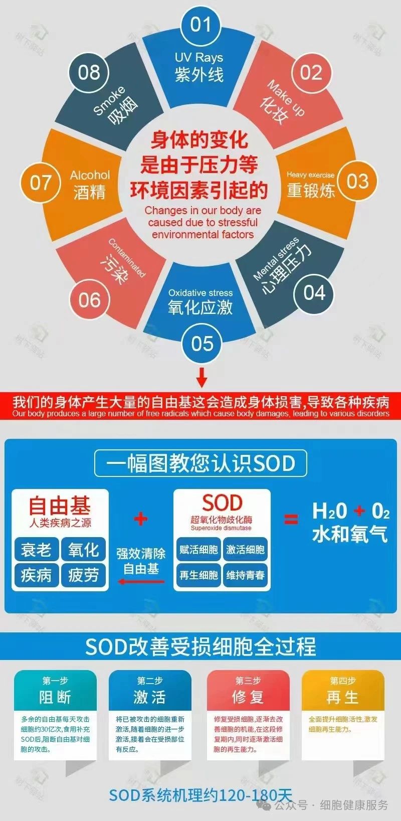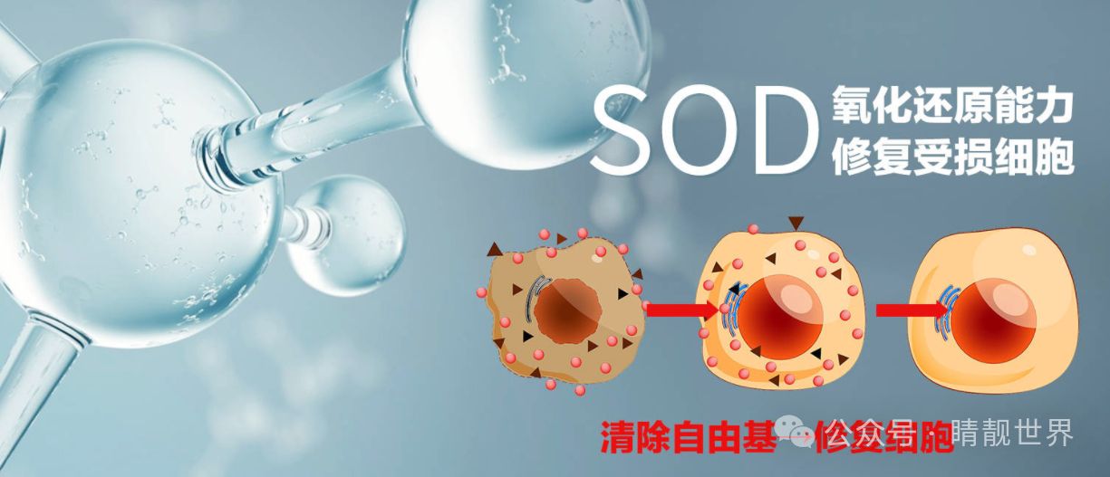 是自由基清除剂―超氧化物歧化酶,我们称之为SOD,可以快速捕捉自由基,使其链条危害无法形成。它能快速有效地补充细胞,逆转细胞老化,快速彻底地清除自由基的毒性,具有快速恢复老化和疾病细胞的功能。