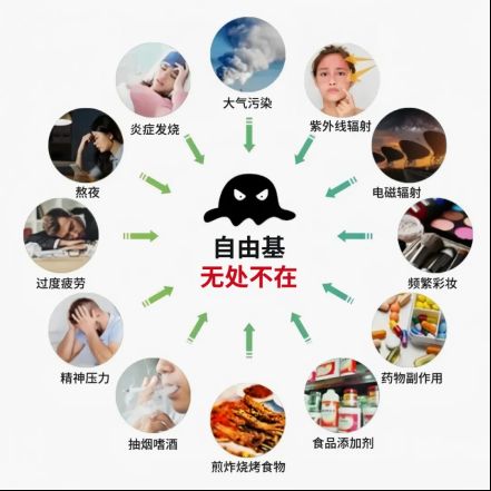 自由基是所有疾病的根源。当产生大量自由基时,它会促进细胞老化和死亡,损害人体器官,甚至损害人体细胞中的DNA,导致细胞变异,从而诱发衰老、肿瘤、血栓形成、糖尿病、动脉硬化和白内障。