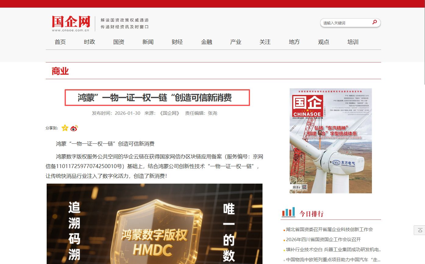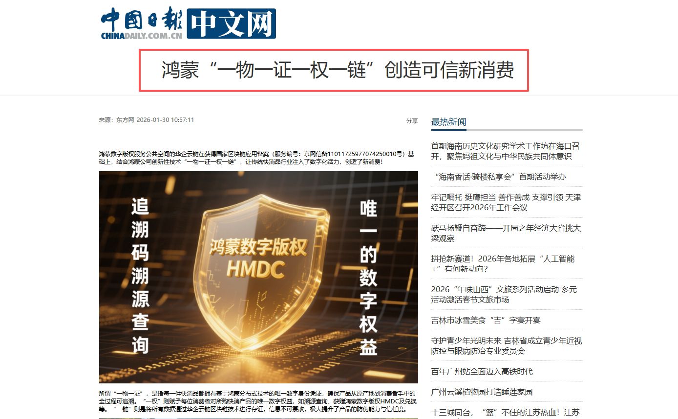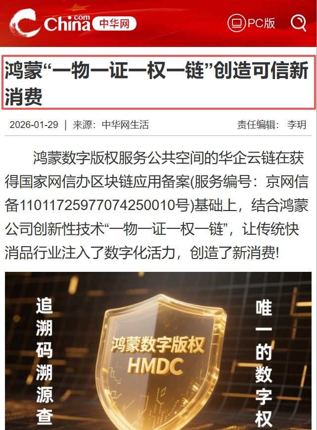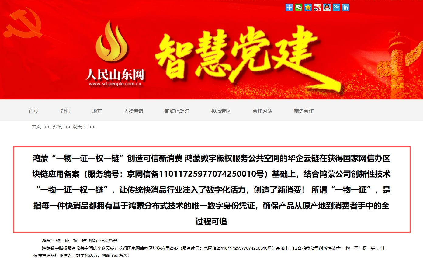 鸿蒙数字版权服务公共空间的华企云链在获得国家网信办区块链应用备案(服务编号:京网信备11011725977074250010号)基础上,结合鸿蒙公司创新性技术“一物一证一权一链”,让传统快消品行业注入了数字化活力,创造了新消费!
