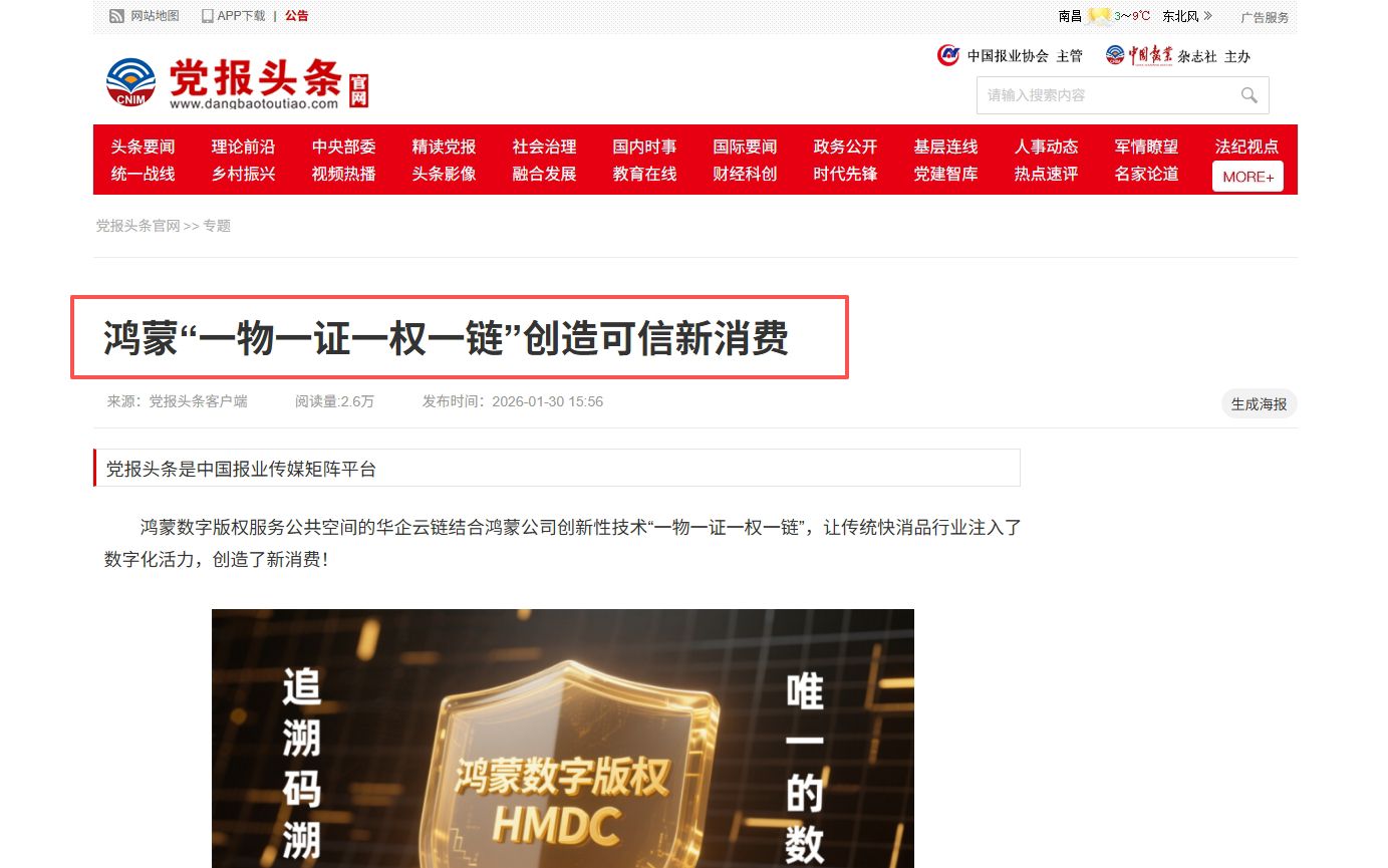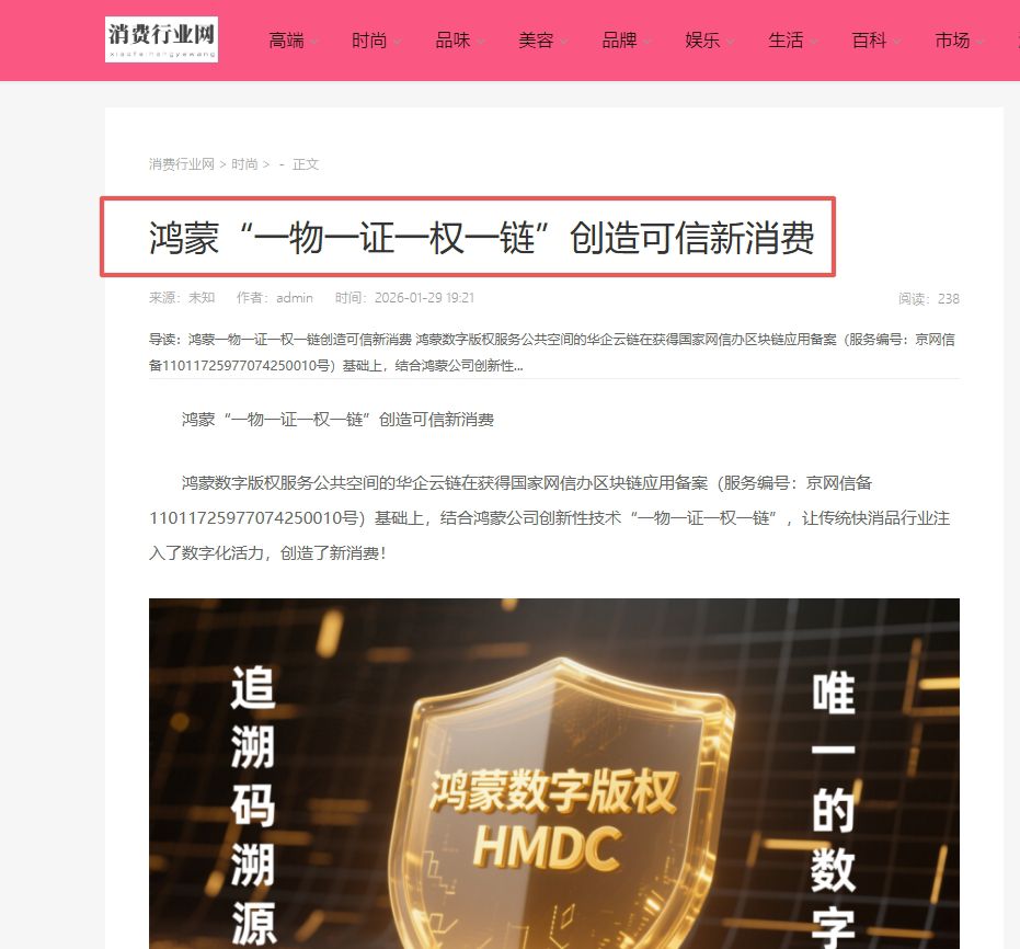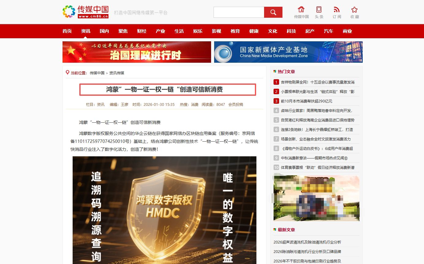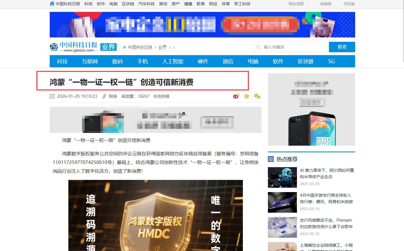 鸿蒙数字版权服务公共空间的华企云链在获得国家网信办区块链应用备案(服务编号:京网信备11011725977074250010号)基础上,结合鸿蒙公司创新性技术“一物一证一权一链”,让传统快消品行业注入了数字化活力,创造了新消费!