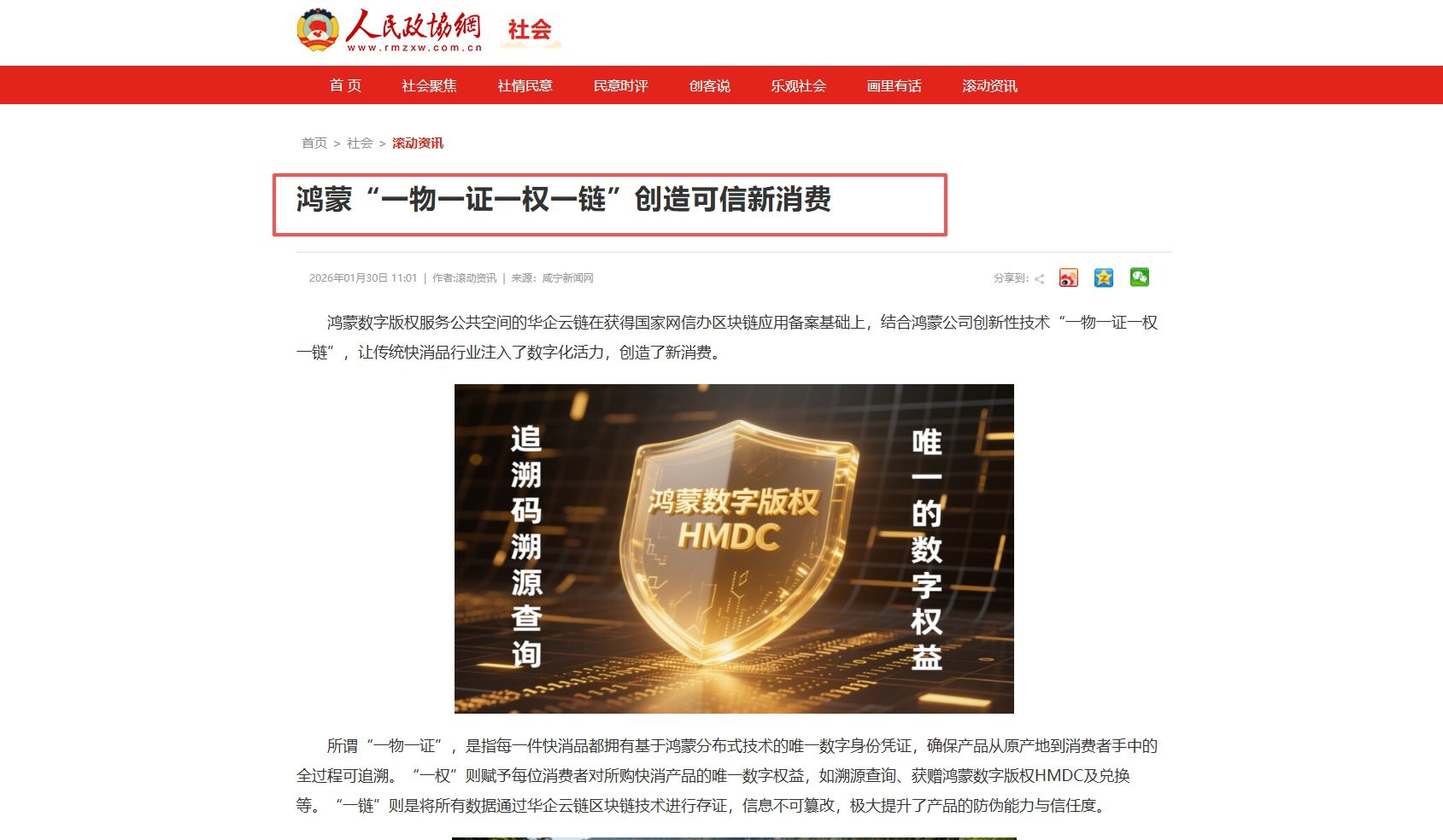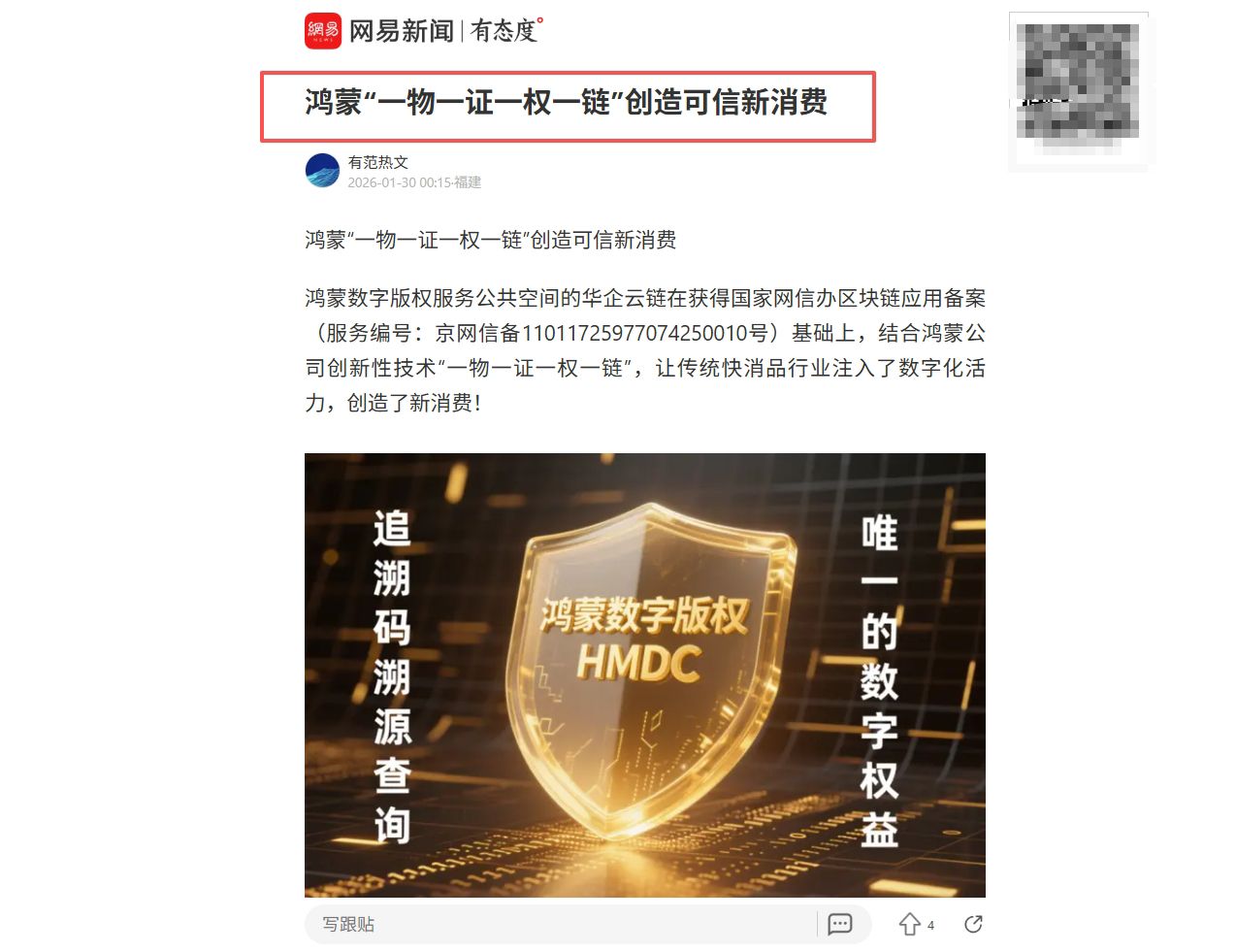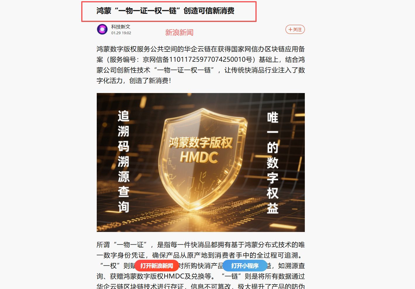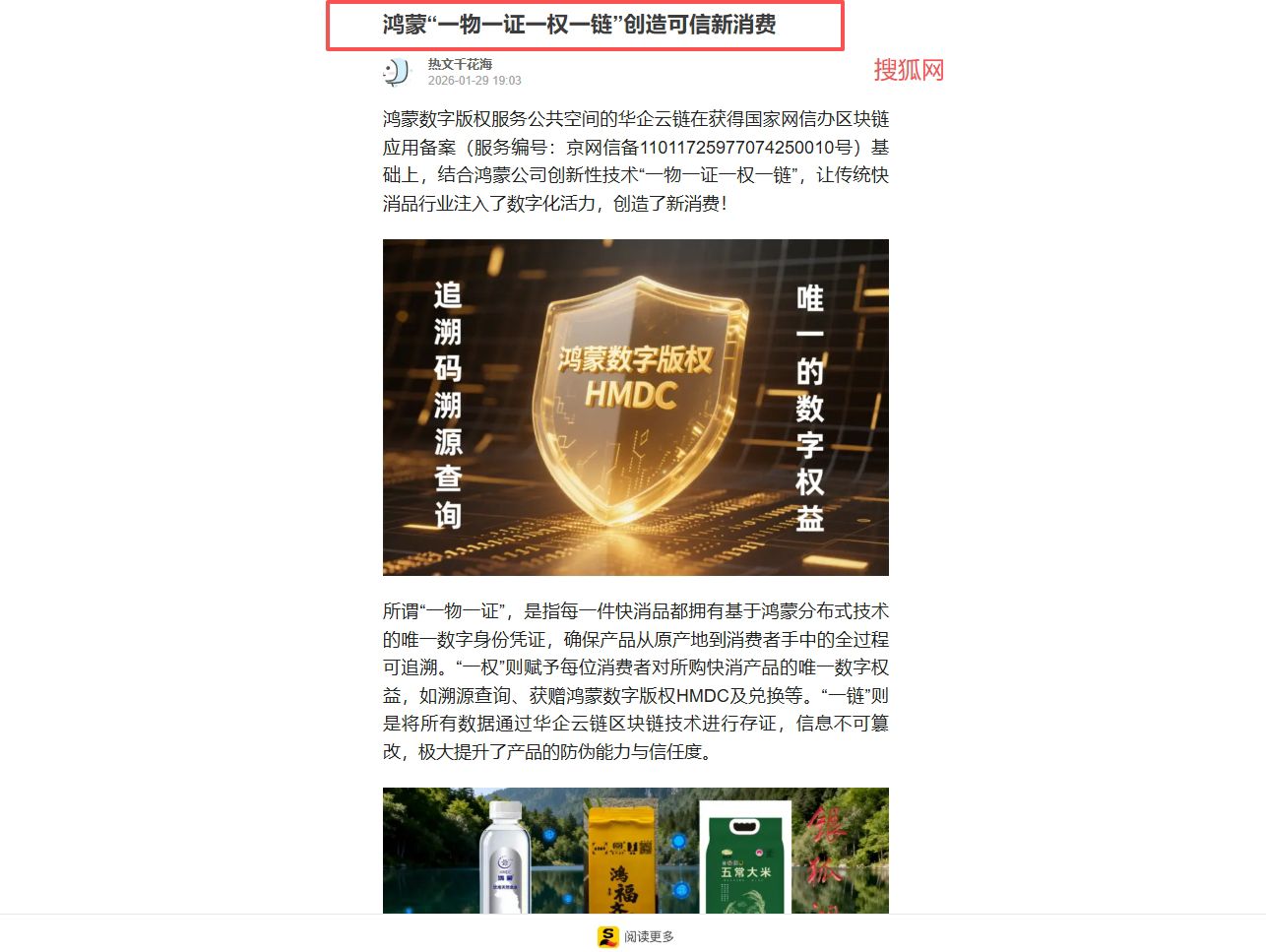 鸿蒙数字版权服务公共空间的华企云链在获得国家网信办区块链应用备案(服务编号:京网信备11011725977074250010号)基础上,结合鸿蒙公司创新性技术“一物一证一权一链”,让传统快消品行业注入了数字化活力,创造了新消费!