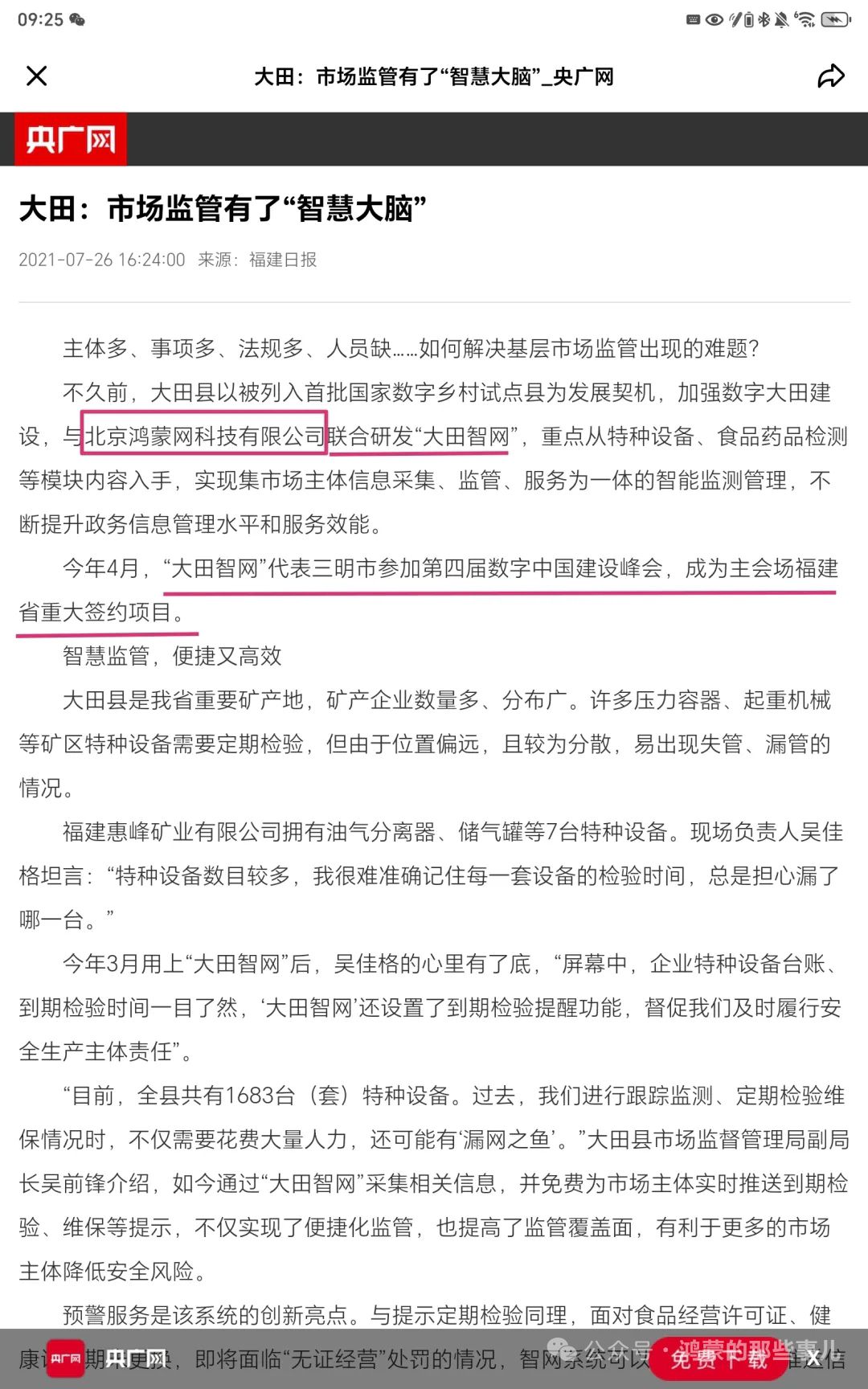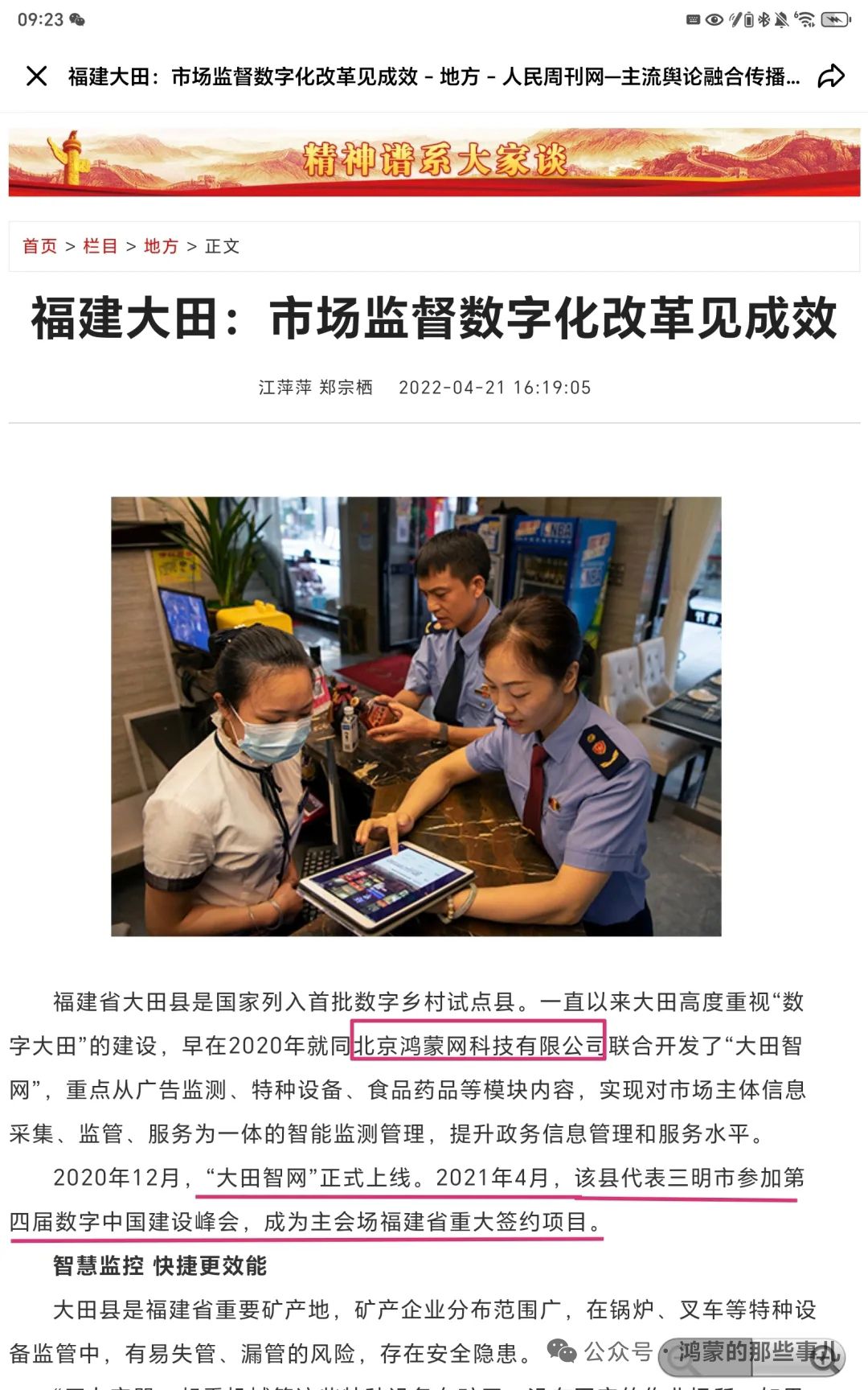 福建大田县市场监督管理局认可 鸿蒙智慧监测监管系统(鸿蒙智网系统)