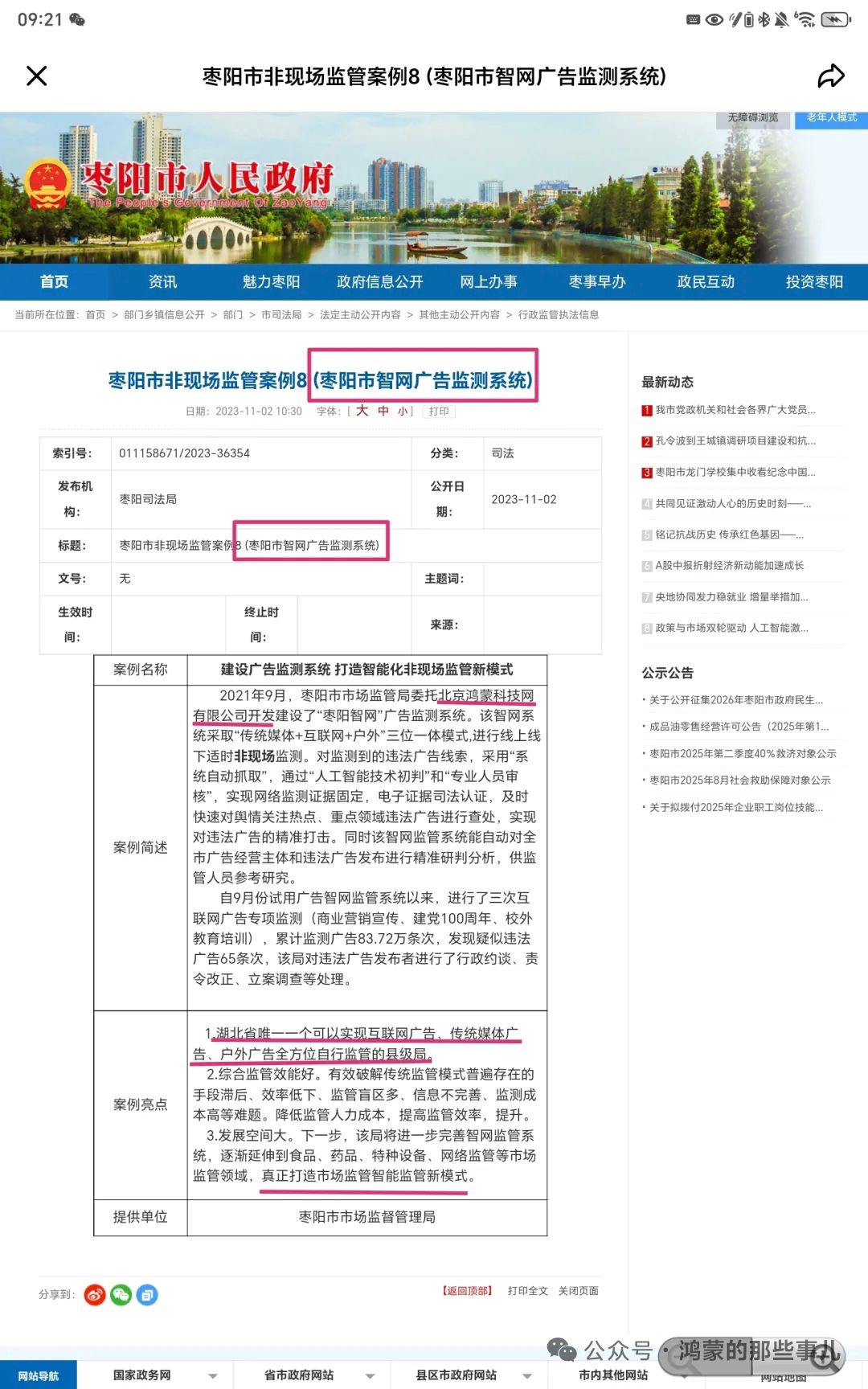 湖北枣阳市市场监督管理局认可 鸿蒙智慧监测监管系统(鸿蒙智网系统)