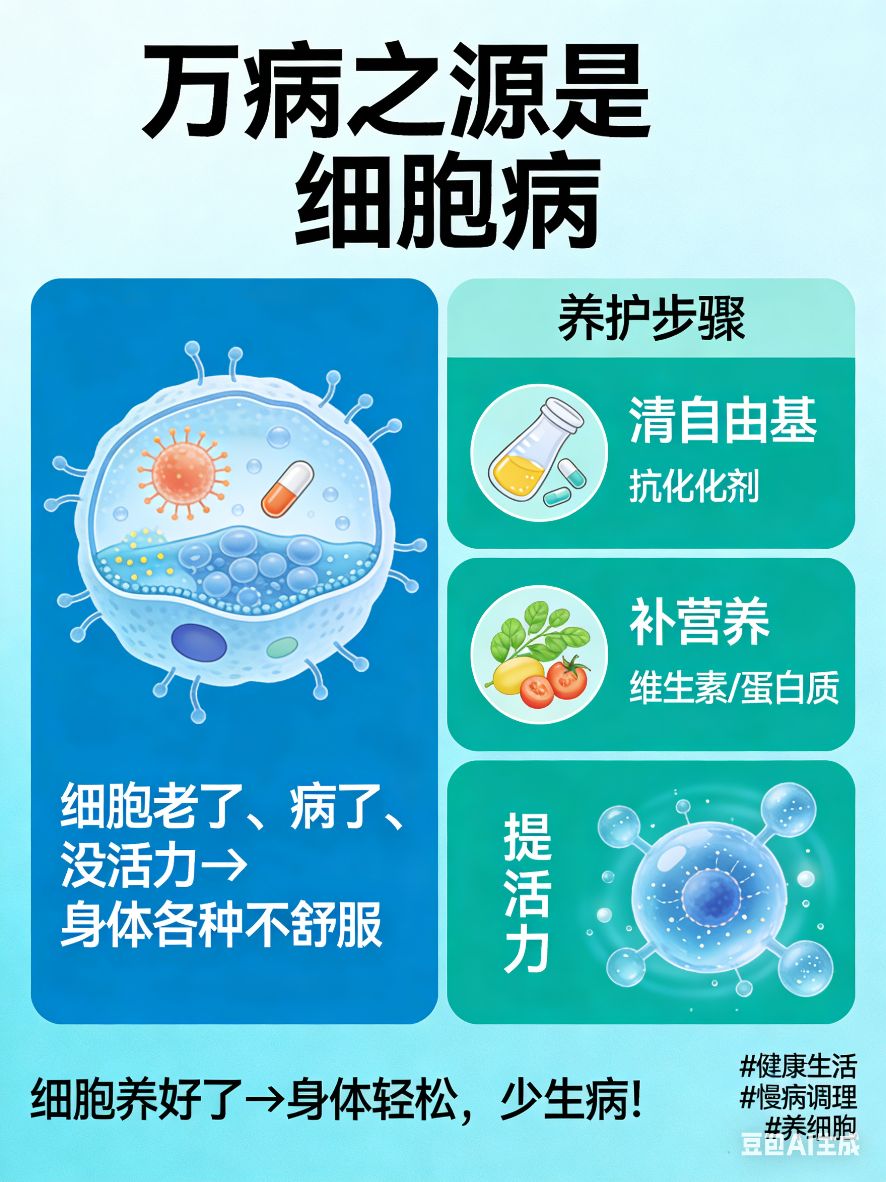 我们不必纠结于病症的名称,而应回归健康本质:守护细胞状态,就是阻断疾病根源。当40-60万亿细胞各司其职、正常代谢、精准修复,身体自然拥有强大的自愈力与抗病力。